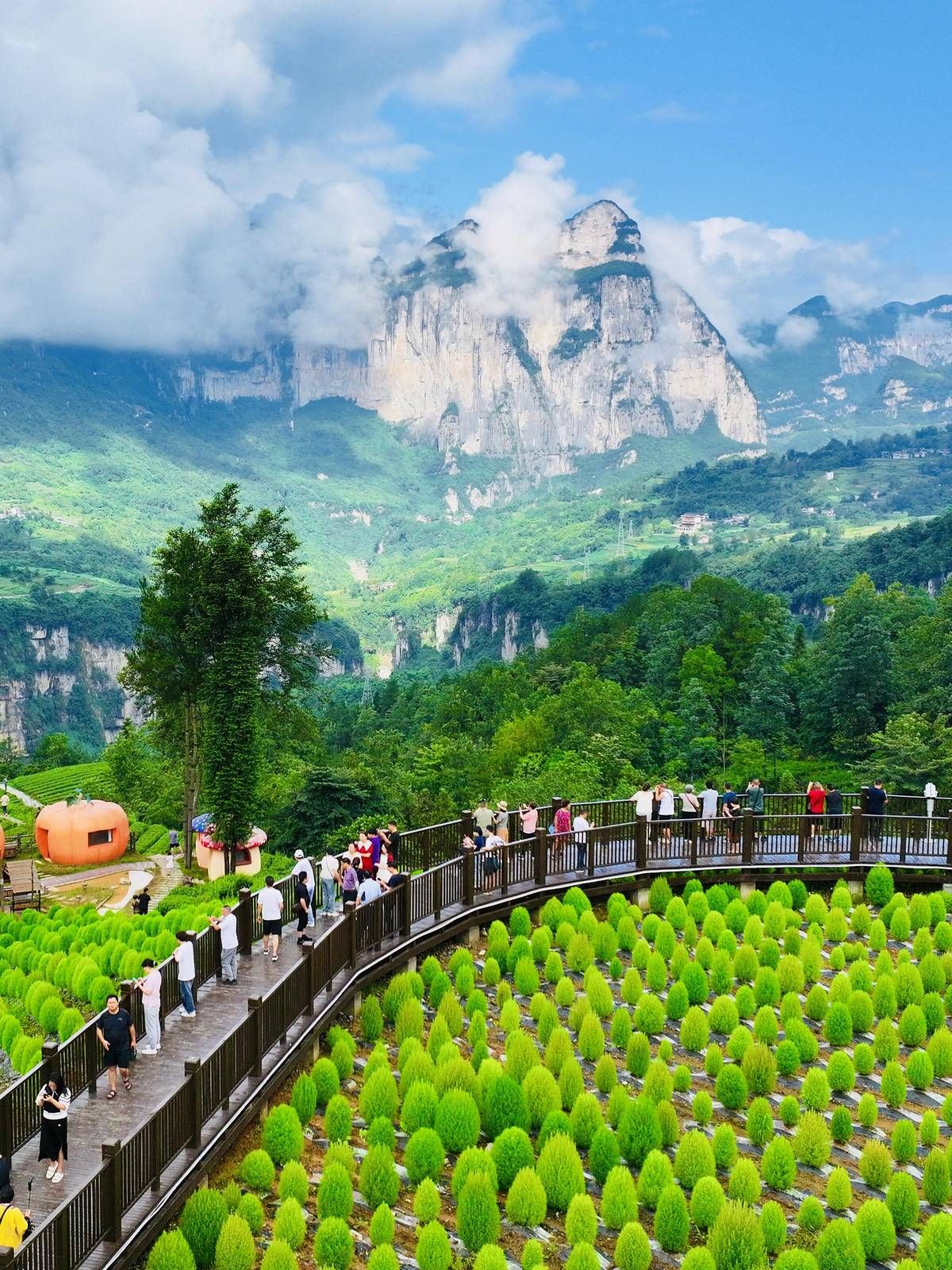 2023年8月2日,恩施市屯堡乡马者村,蓝天白云,青山叠嶂,吸引众多游客前来拍照打卡。(视界网 张远明 摄)