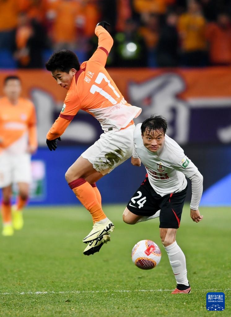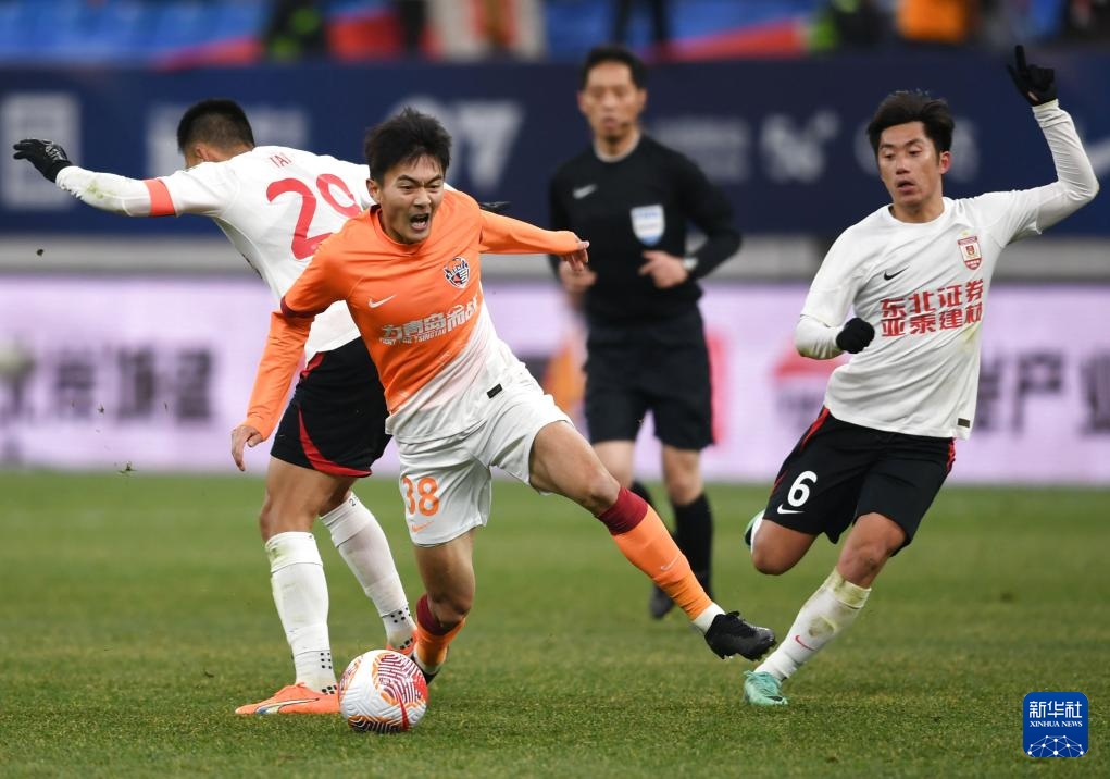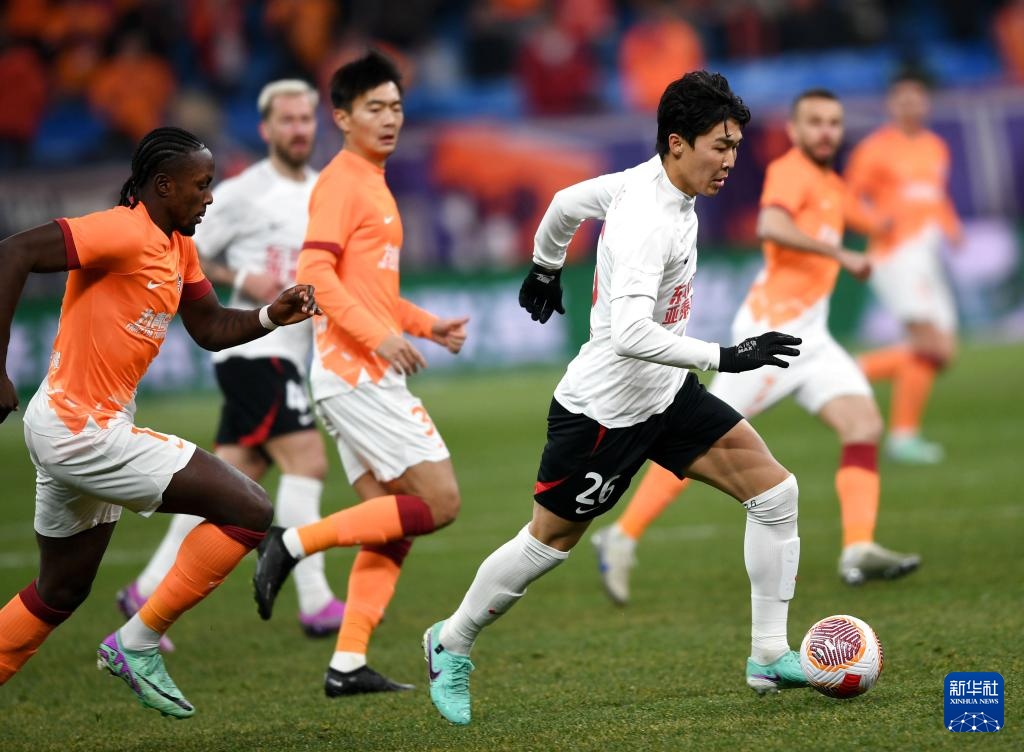 3月8日,长春亚泰队球员元敏诚(前右)在比赛中带球突破。新华社记者 李紫恒 摄