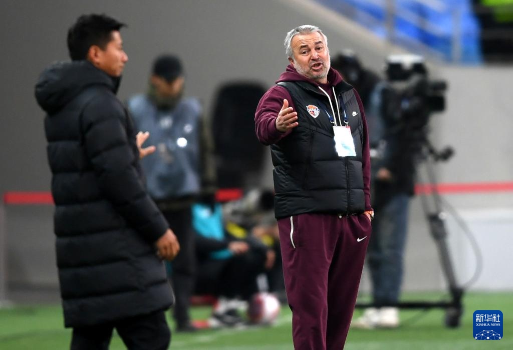 3月8日,青岛海牛队主教练亚森(右)在场边指挥。新华社记者 李紫恒 摄