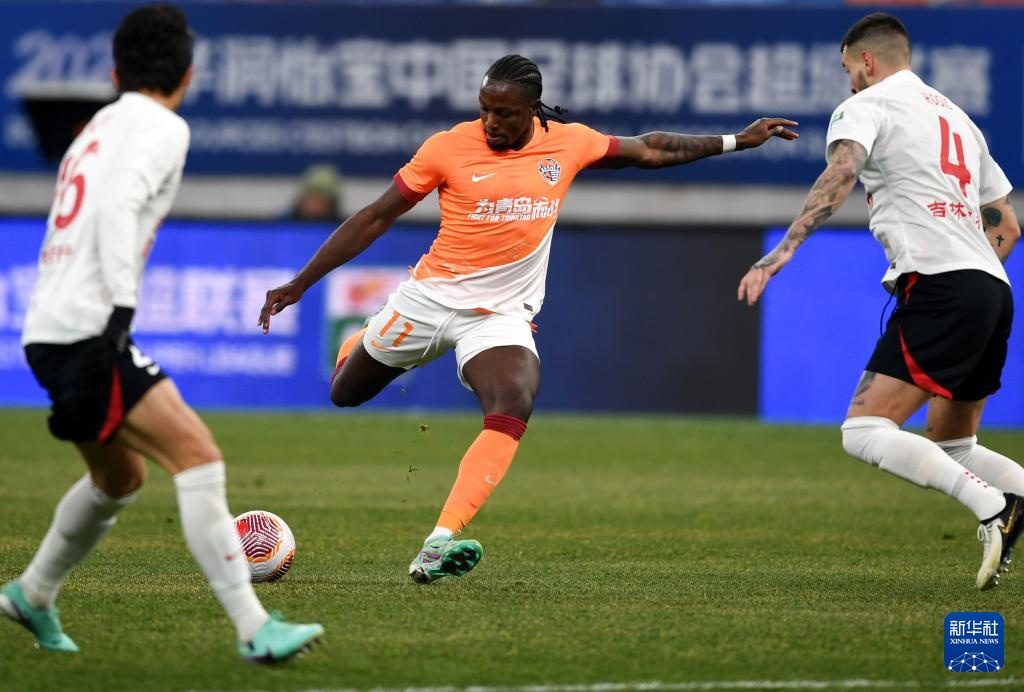 3月8日,青岛海牛队球员博阿基耶(中)在比赛中射门。新华社记者 李紫恒 摄