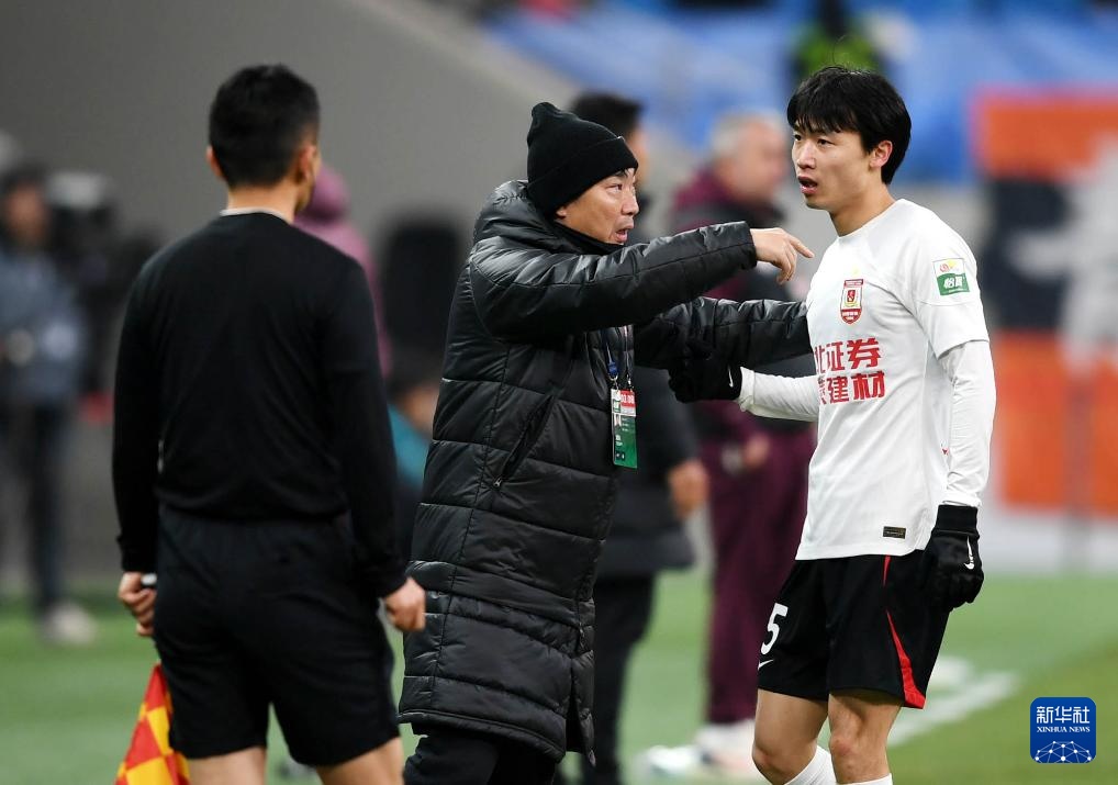 3月8日,长春亚泰队主教练陈洋(中)在场边向球员李申圆(右)布置战术。新华社记者 李紫恒 摄