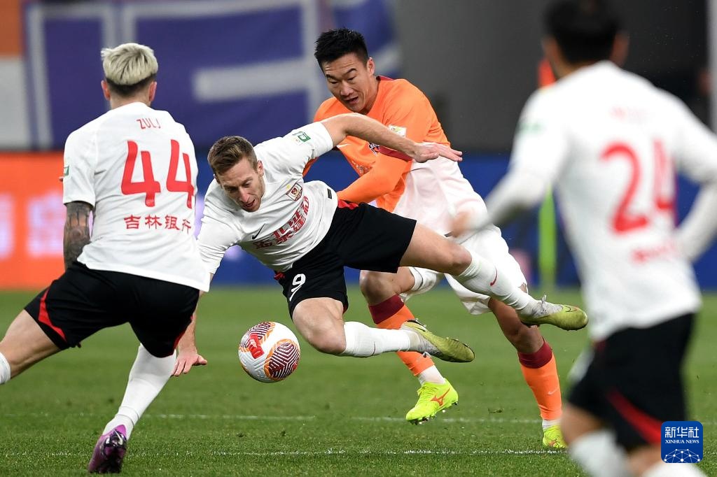 3月8日,长春亚泰队球员张华晨(右二)与青岛海牛队球员张威(右一)拼抢。新华社记者 李紫恒 摄