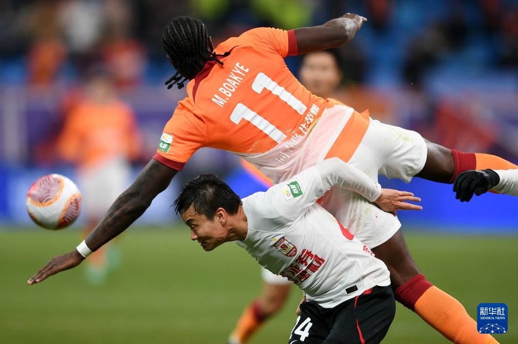 3月8日,长春亚泰队球员严智宇(下)与青岛海牛队球员博阿基耶拼抢。新华社记者 李紫恒 摄