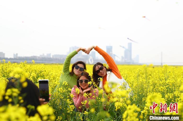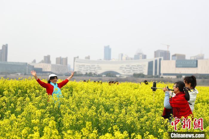 图为在江西省南昌市东湖区扬子洲镇三联村裘家洲滩头,市民游客徜徉油菜花海拍照。刘占昆 摄