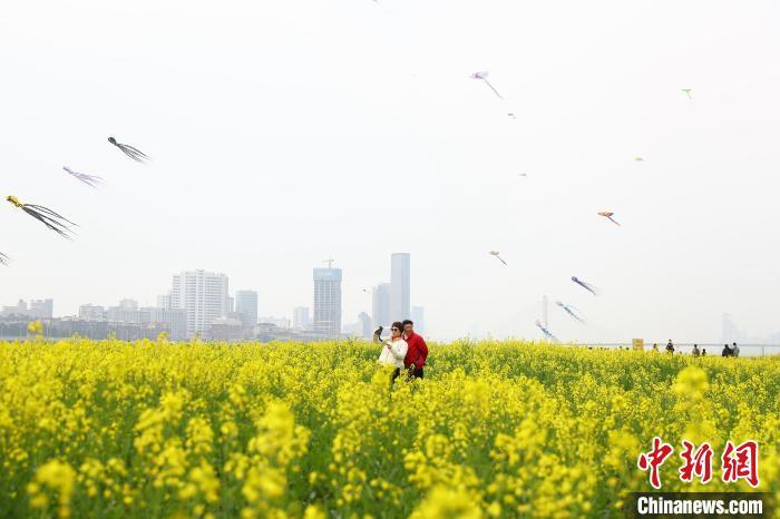 图为在江西省南昌市东湖区扬子洲镇三联村裘家洲滩头,市民游客徜徉油菜花海,踏青赏春。刘占昆 摄