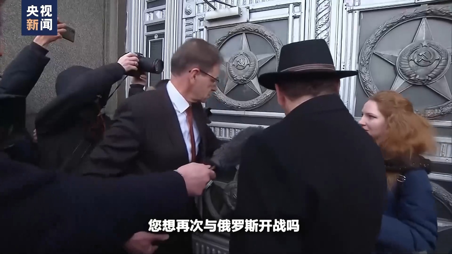3月4日,德国驻俄罗斯大使亚历山大·兰姆斯多夫在俄外交部大楼前,被记者团团围住。