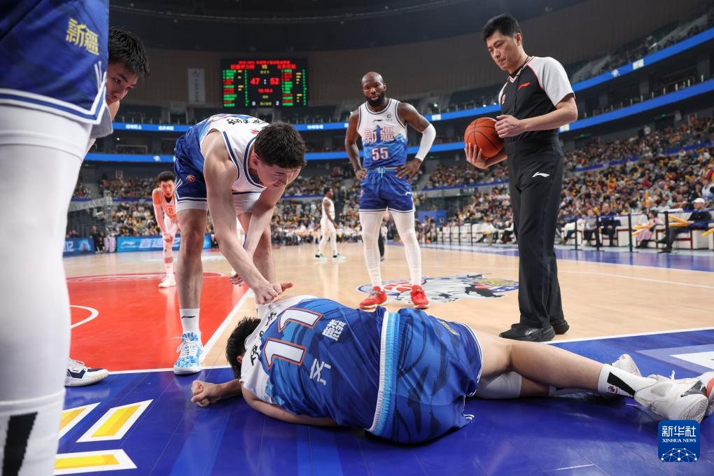 3月10日,新疆伊力特队球员齐麟(下)在比赛中倒地。新华社记者 胡虎虎 摄