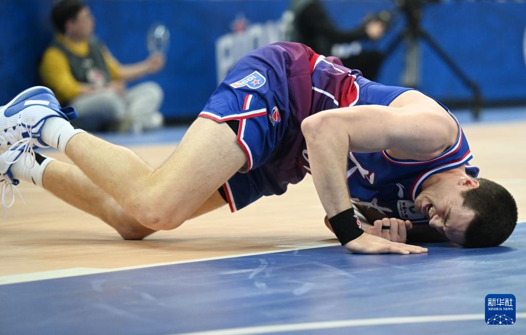 3月10日,天津先行者队球员詹姆斯在比赛中倒地。新华社记者 赵子硕 摄