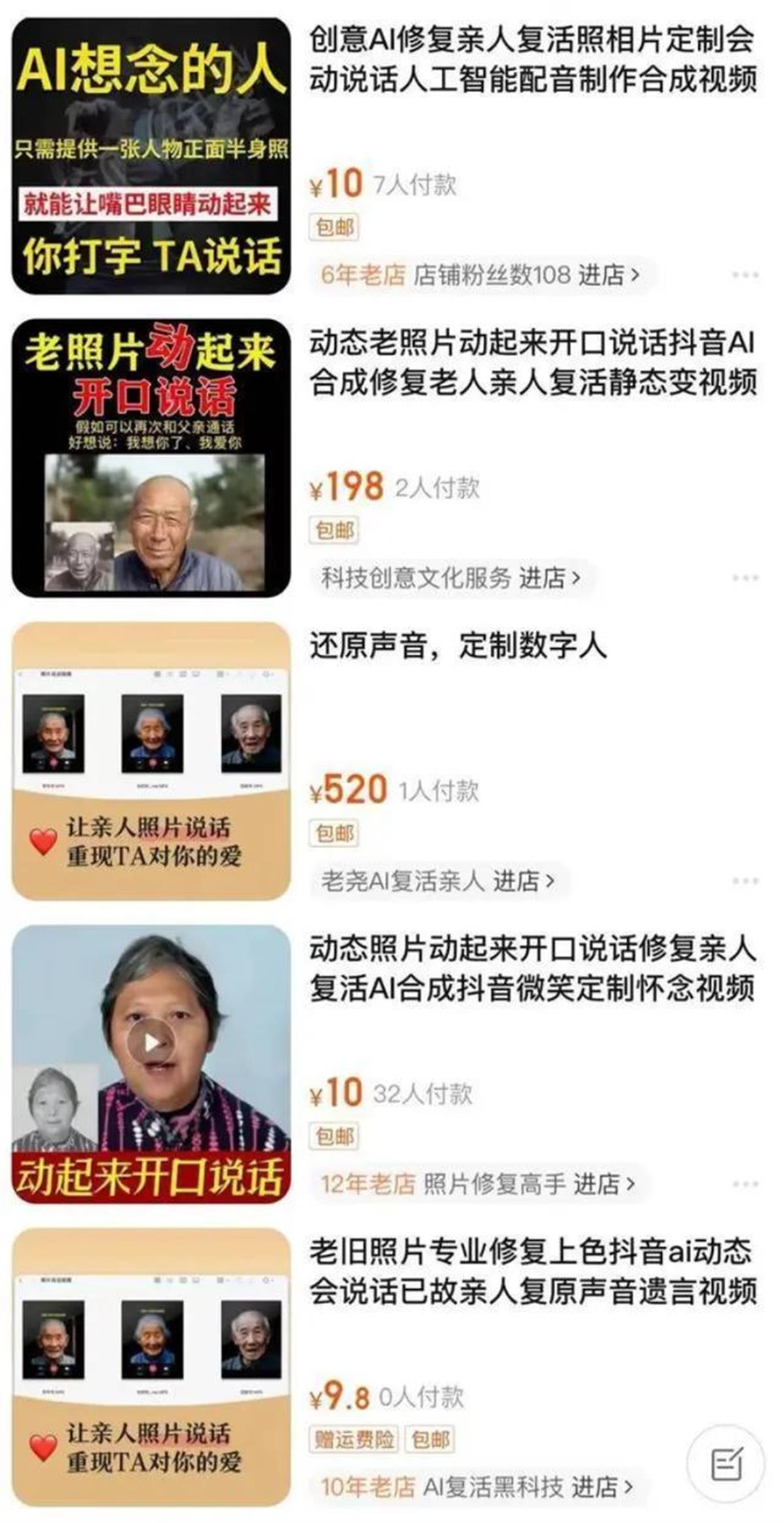 记者近日调查发现,用AI“复活”逝去的人,已经发展成了一门生意。在电商平台搜索“AI复活亲人”,发现提供此类服务的店铺不少,价格从10元到520元不等。有店铺称,可以提供“修复老照片+让照片动起来”和“照片开口说话”功能。