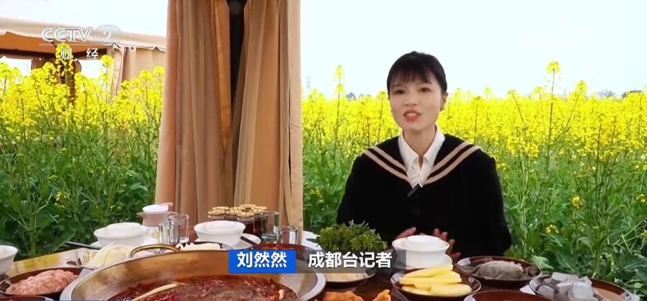 成都台记者刘然然在现场介绍,这里是成都崇州的道明镇,身后就是一望无际的油菜花田,而在她身旁是刚刚采摘下的春日限定油菜薹。暖阳的照耀下红锅热气腾腾,麻辣的香气和油菜花的味道扑面而来,也引得众多游客到此共赴一场“春天里的约会”。