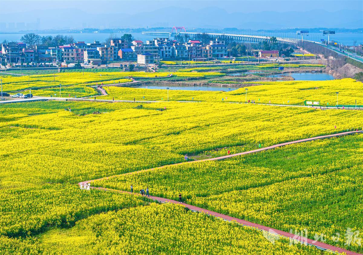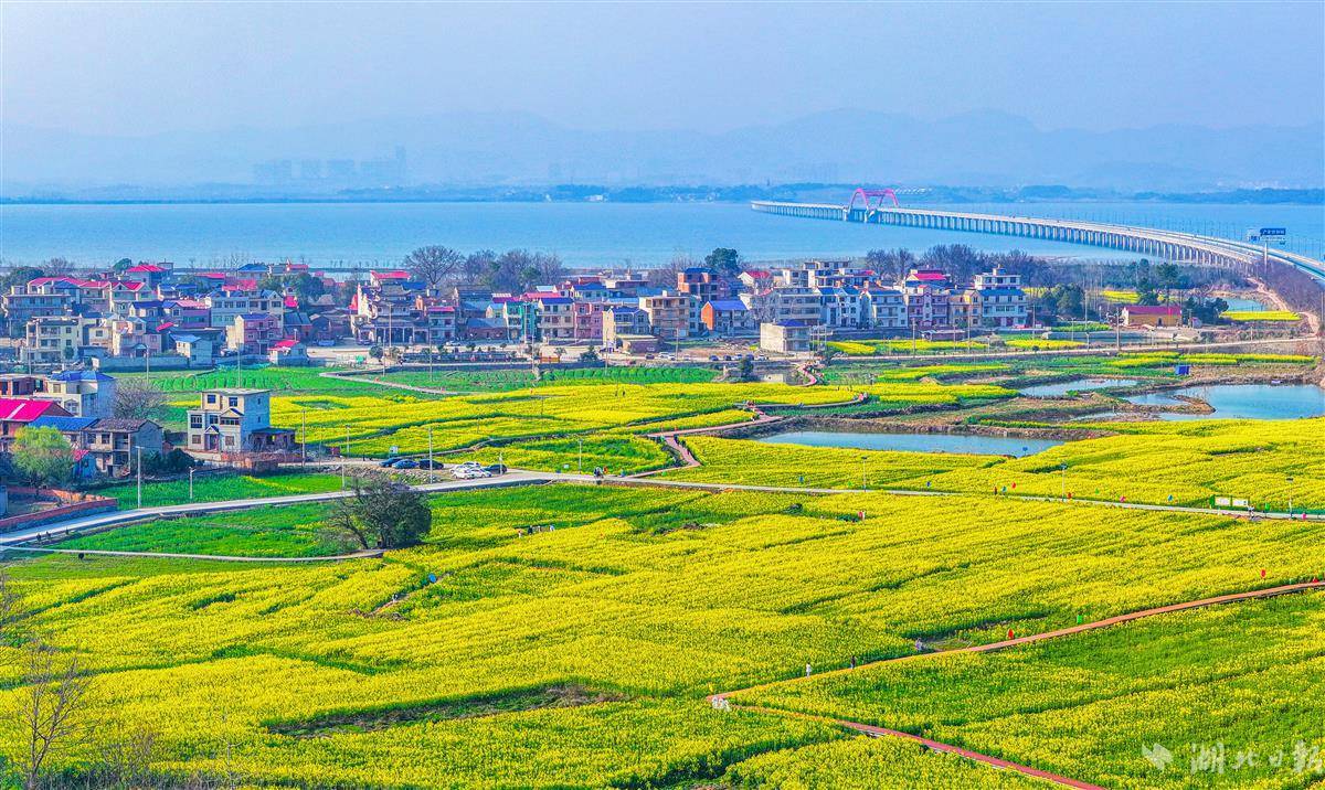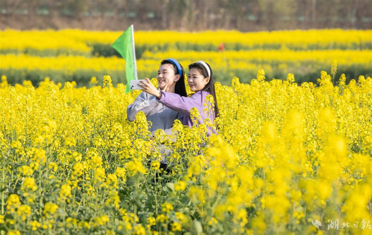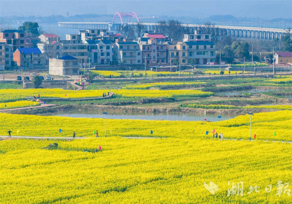 3月11日,黄石太子镇塘埠村千亩油菜花迎春绽放,金色花海和美丽乡村相映成景,吸引不少游客前来赏花游玩。近年来,黄石积极推动农旅融合发展,打造生态旅游休闲目的地,以花为媒,做强美丽经济,助力乡村振兴。(湖北日报全媒记者 薛婷 通讯员 周巍 张成 摄)