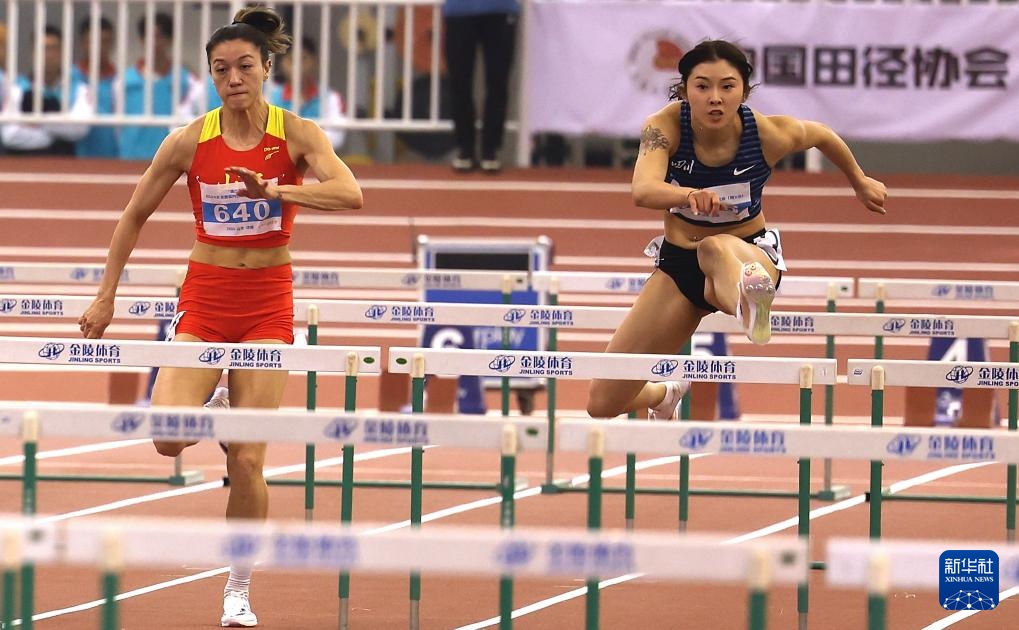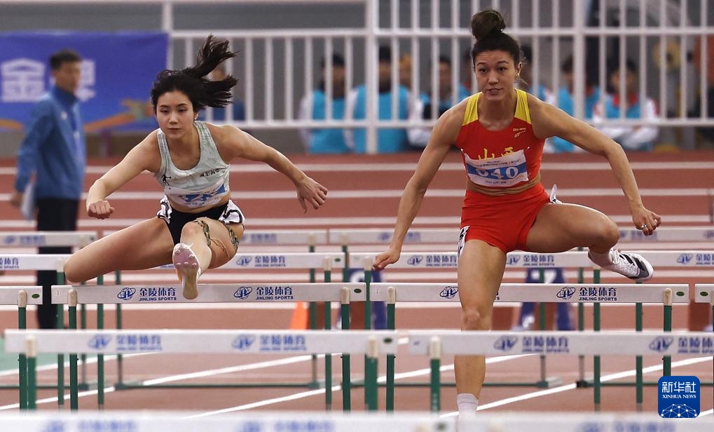 3月13日,湖南队选手夏思凝(左)与山西队选手郑妮娜力在女子60米栏决赛中。夏思凝以8秒47的成绩获得第五名,郑妮娜力以8秒48的成绩获得第六名。新华社记者 廖宇杰 摄