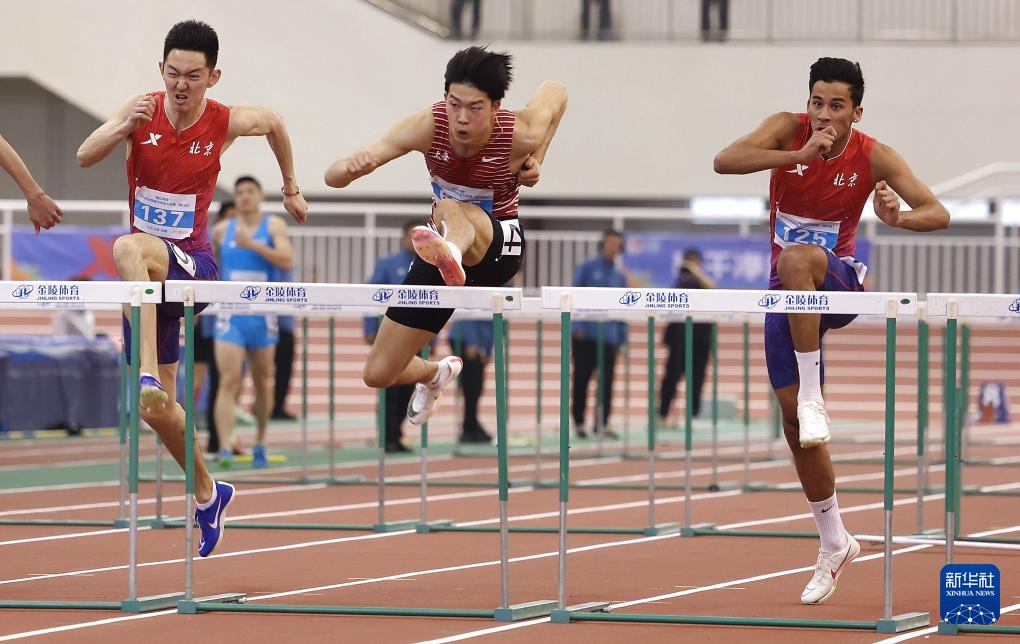 3月13日,上海队选手秦伟搏(中)在男子60米栏决赛中。他以7秒71的成绩获得冠军。新华社记者 廖宇杰 摄