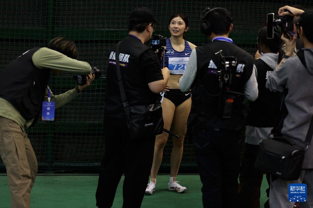 3月13日,四川队选手吴艳妮在女子60米栏决赛后接受媒体拍摄和采访。她以8秒11的成绩获得冠军。新华社记者 廖宇杰 摄