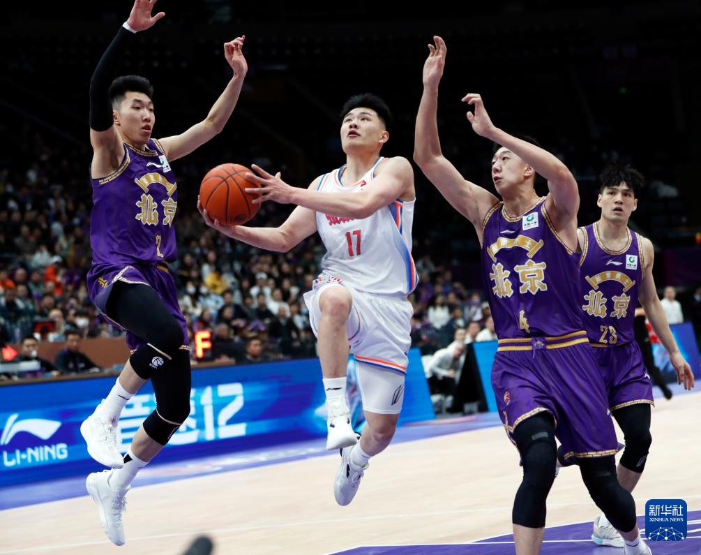3月13日,北京控股队球员费尔德(中)在比赛中突破。新华社记者 雒圆 摄