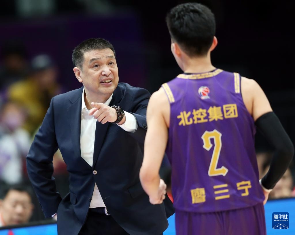 3月13日,北京控股队主教练闵鹿蕾(左)在比赛间隙指导球员廖三宁。新华社记者 雒圆 摄