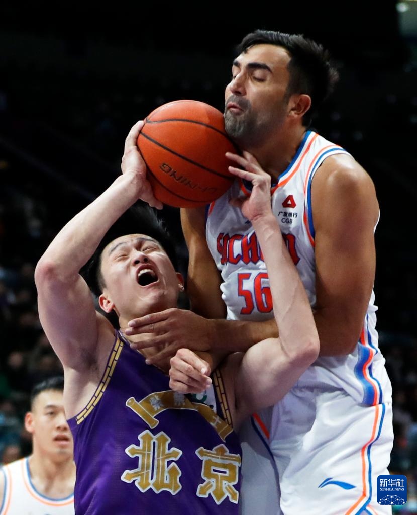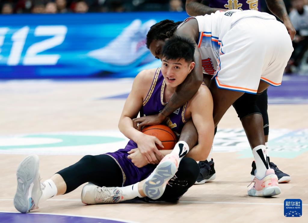 3月13日,北京控股队球员俞长栋(下)和四川金强队球员奥贝克帕在比赛中拼抢。新华社记者 雒圆 摄