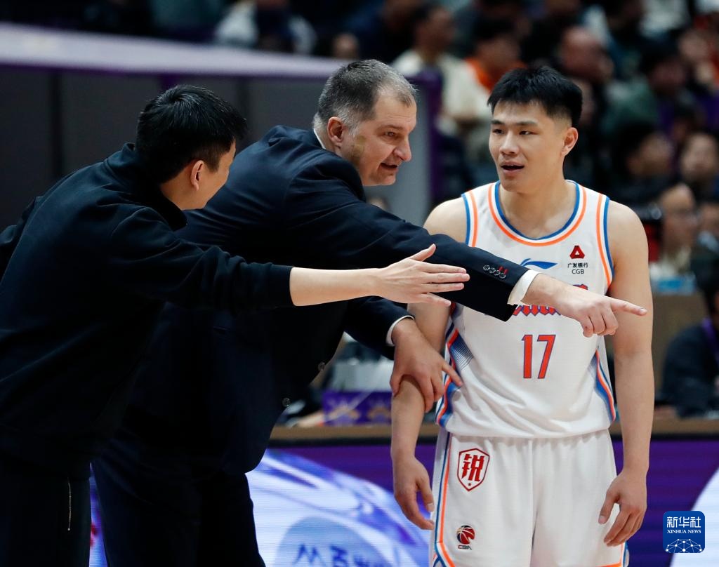 3月13日,四川金强队主教练布拉尼斯拉夫·维琴蒂奇(中)在比赛间隙指导球员方佳晨(右)。新华社记者 雒圆 摄