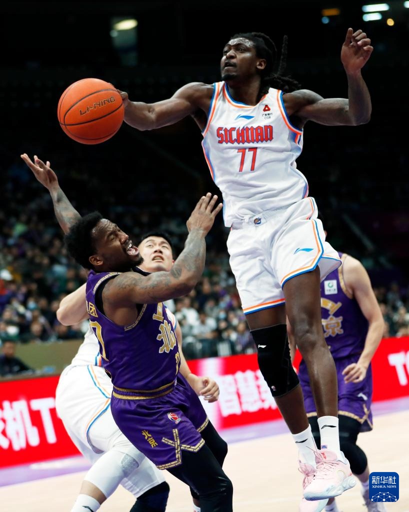 3月13日,北京控股队球员费尔德(左)上篮时被四川金强队球员奥贝克帕盖帽。新华社记者 雒圆 摄