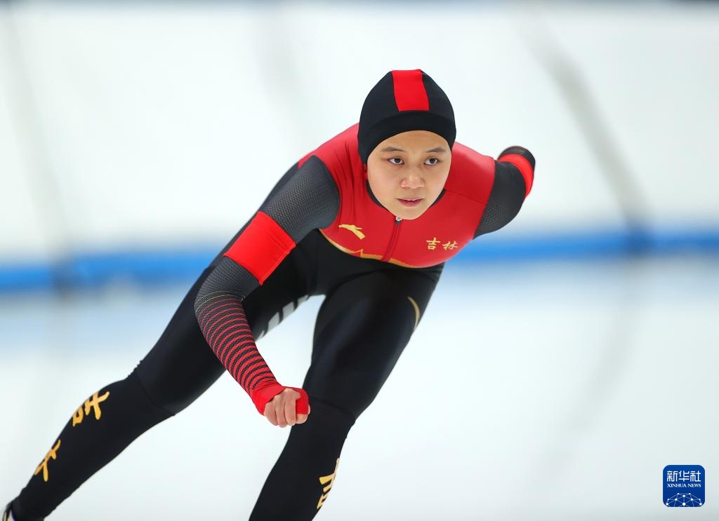 3月14日,牡丹江市体育局选手李佳轩在女子全能3000米比赛中。她以4分20秒81的成绩获得该项目第三名。新华社记者 丁旭 摄