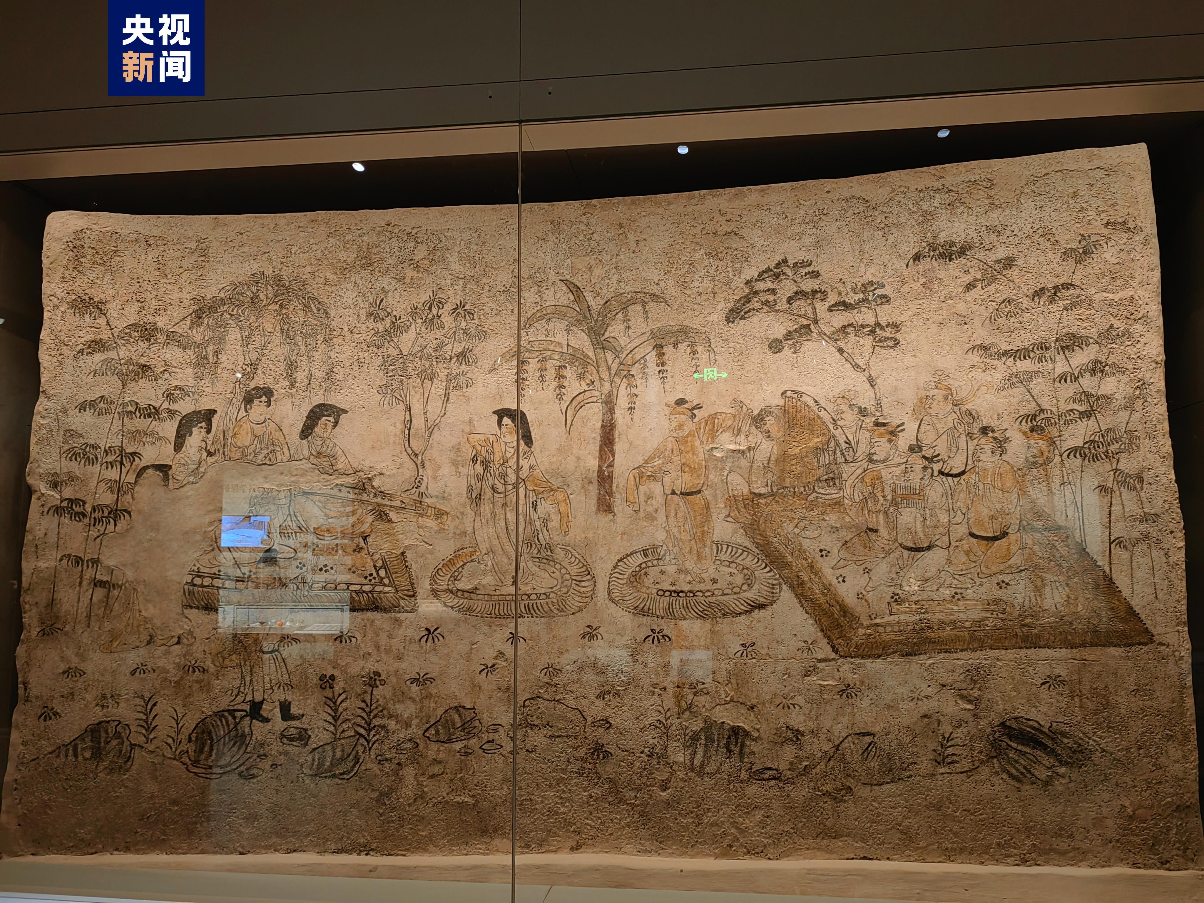 此次展出的壁画包括拱手仕女图、高士图、山水图、朱雀图、玄武图、乐舞图等,其中发现于韩休墓室北壁东侧的山水图,是我国迄今所见最早的古代独幅山水壁画,将我国绘画史上独幅写实山水的历史从宋代提前到了唐代;东壁的两组歌舞伎乐共舞图,完整再现了唐代乐舞的场景,对中国古代乐舞研究具有重要意义,开创了同类题材的新篇章。