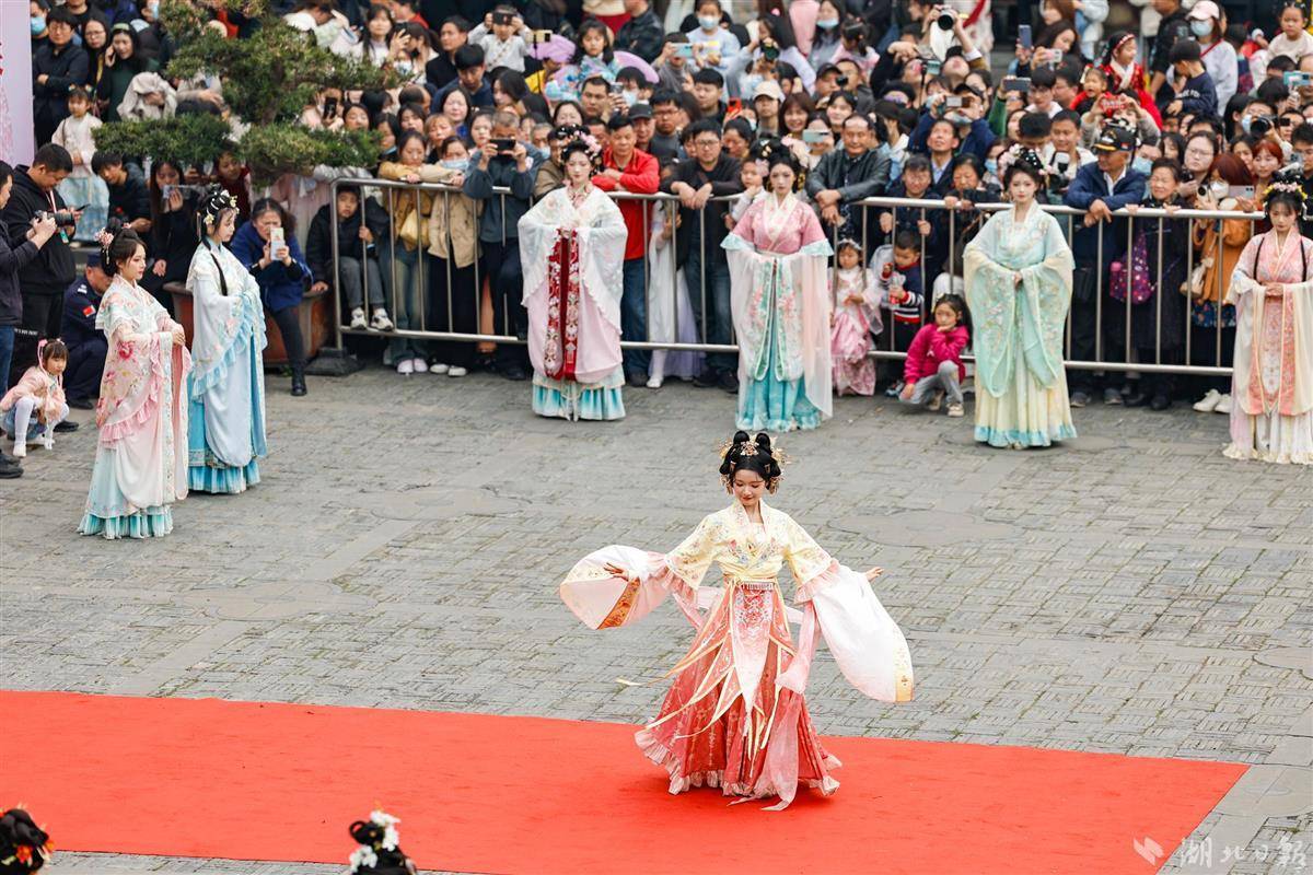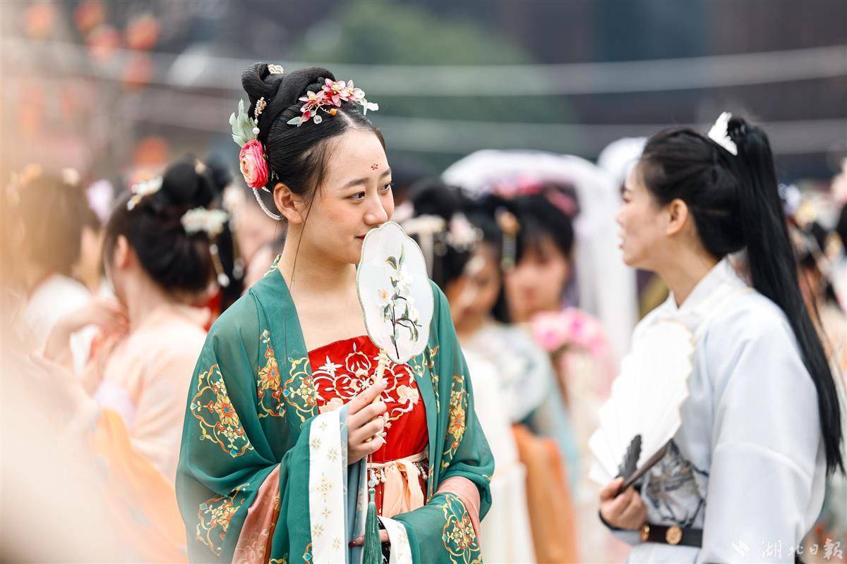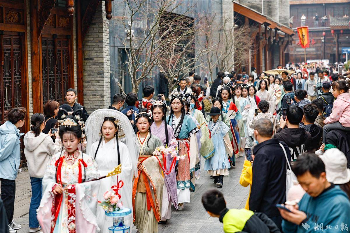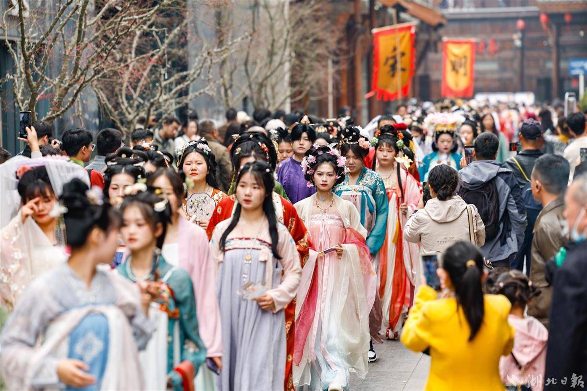 3月16日,1000多名汉服爱好者组成20多个巡游方阵在园内外巡游,吸引了不少游客前来游玩,感受国风魅力。当日,武汉园博园第五届汉口里花朝节开幕。据介绍,作为武汉赏花季活动之一的汉口里花朝节,主要突出“楚地风雅、高校参与、网红效应、观灯夜游”四大特色。花朝节期间,园区还安排有观十二花神花灯、非遗打铁花、舞台夜演、国风蹦迪,十二花神走秀等“月夜度花朝”活动,整个花朝节将持续到4月21日。(湖北日报全媒记者 倪娜 通讯员 徐志刚 晏君 摄)