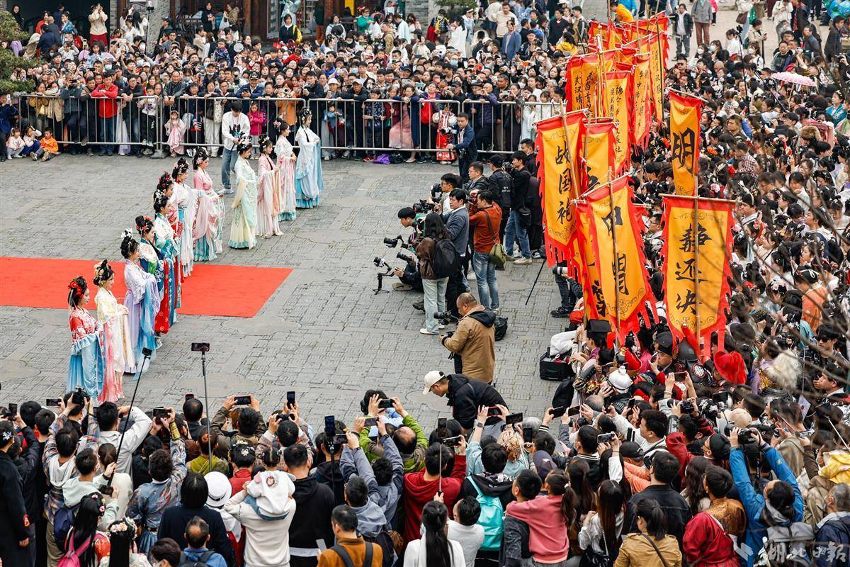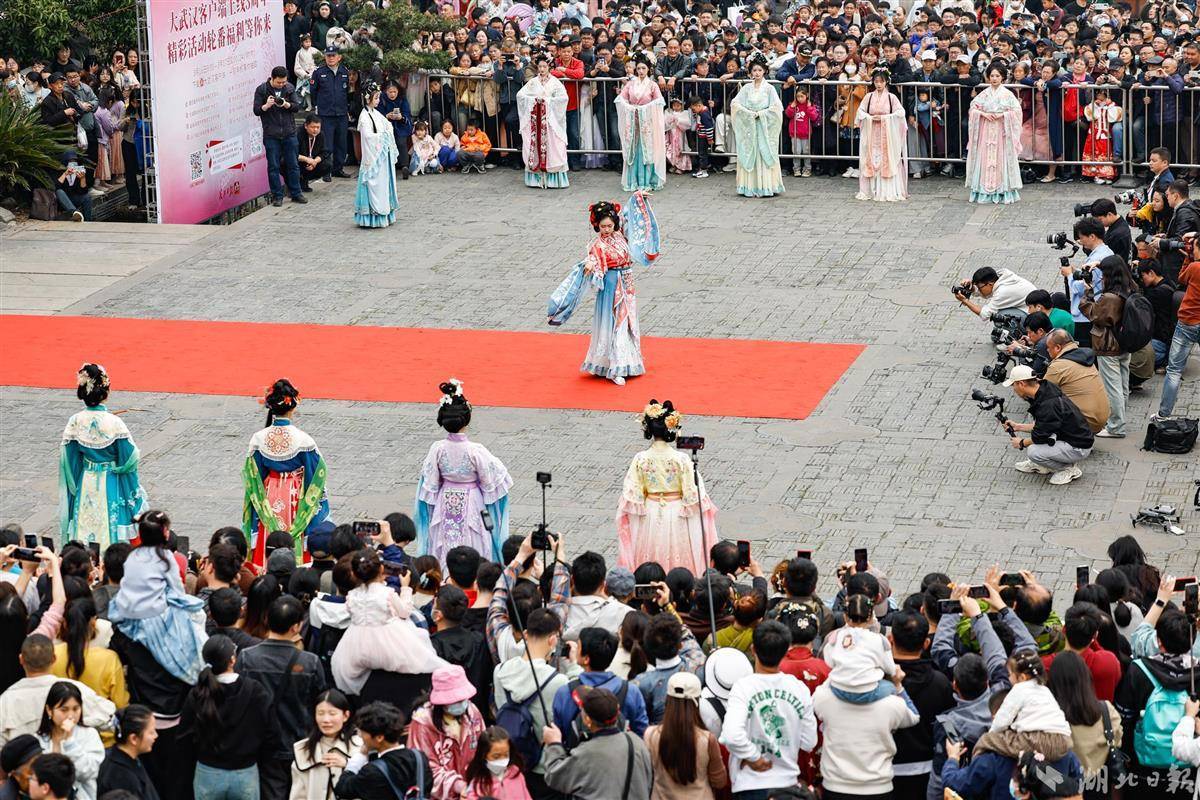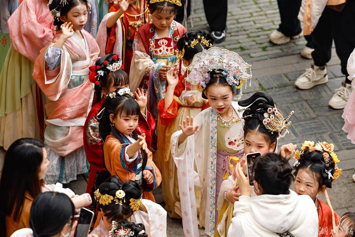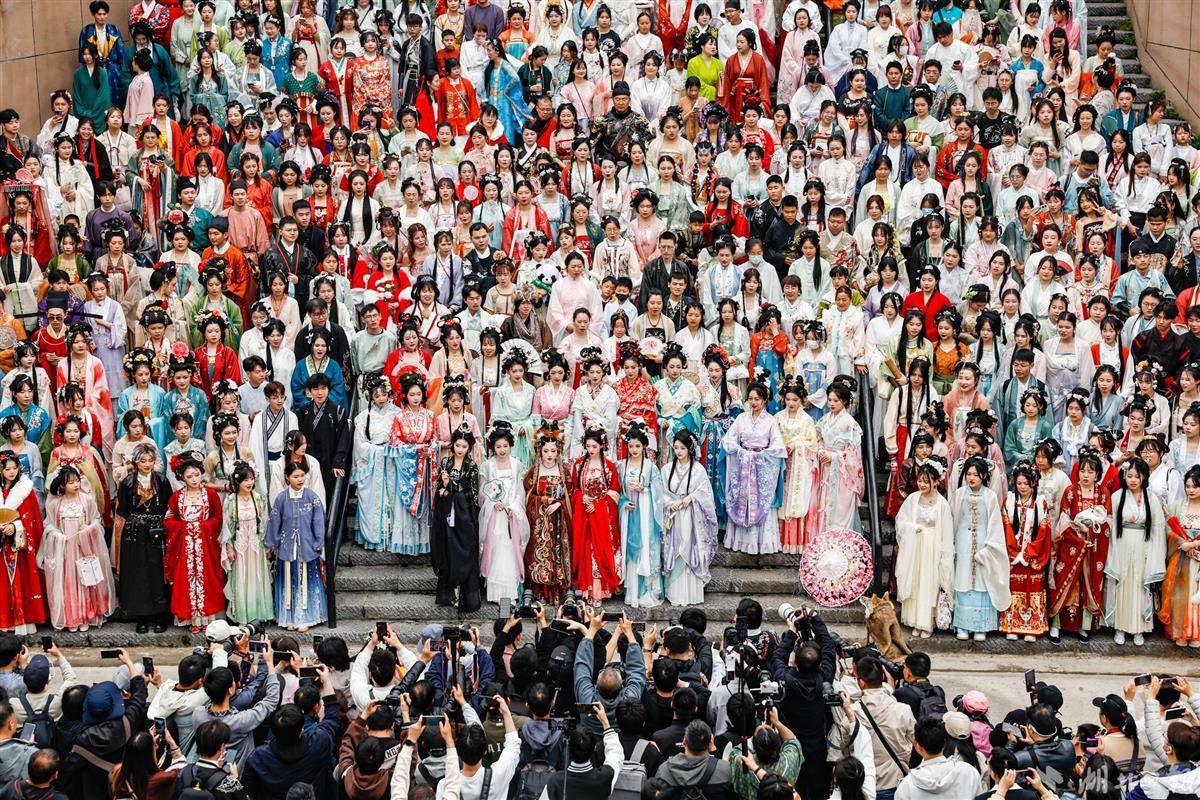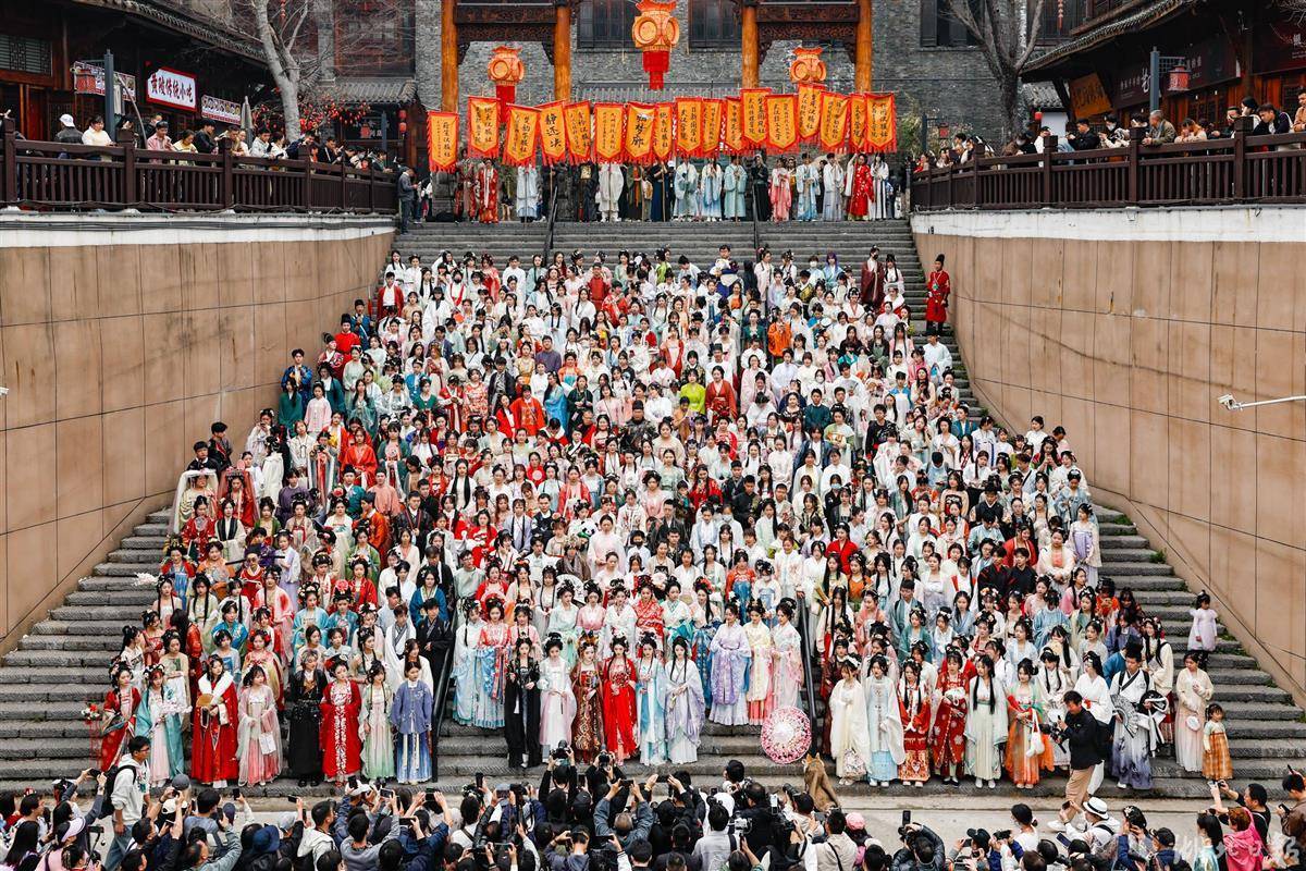 3月16日,1000多名汉服爱好者组成20多个巡游方阵在园内外巡游,吸引了不少游客前来游玩,感受国风魅力。当日,武汉园博园第五届汉口里花朝节开幕。据介绍,作为武汉赏花季活动之一的汉口里花朝节,主要突出“楚地风雅、高校参与、网红效应、观灯夜游”四大特色。花朝节期间,园区还安排有观十二花神花灯、非遗打铁花、舞台夜演、国风蹦迪,十二花神走秀等“月夜度花朝”活动,整个花朝节将持续到4月21日。(湖北日报全媒记者 倪娜 通讯员 徐志刚 晏君 摄)