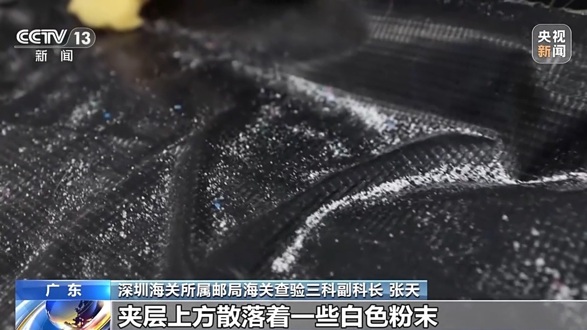 深圳海关所属邮局海关查验三科副科长 张天:夹层上方散落着一些白色粉末,闻起来有洗衣粉的气味,夹层内有袋装的植物制品,经取样进行现场快筛,结果显示为大麻阳性。