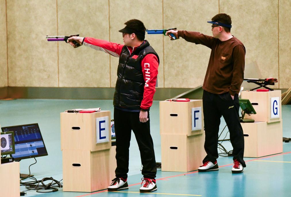 3月17日,山东队选手张博文(右)和安徽队选手胡凯在男子10米气手枪决赛中。新华社记者 姚友明 摄