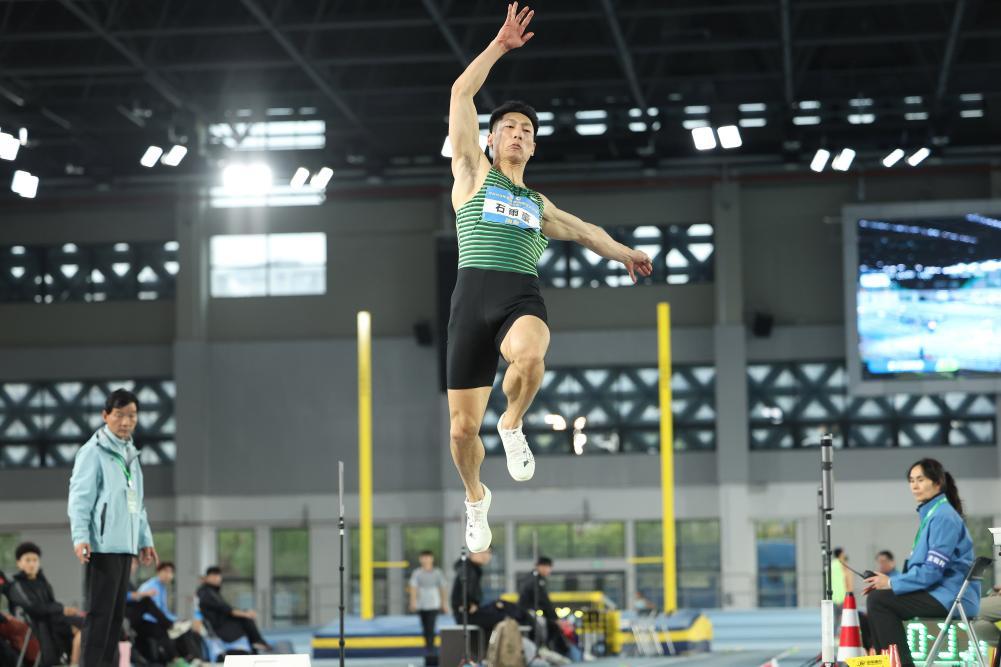3月17日,江苏队选手石雨豪在男子跳远决赛中试跳。新华社记者 李明 摄