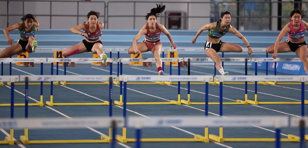 3月17日,湖南队选手夏思凝(中)在女子60米栏决赛中。新华社记者 廖宇杰 摄