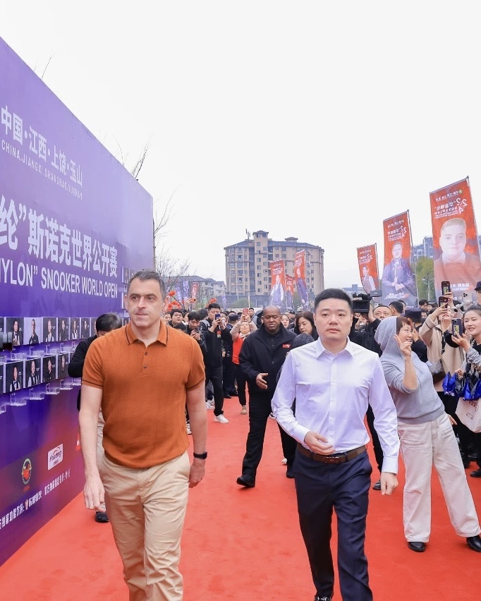 奥沙利文、丁俊晖在世界公开赛红毯仪式上亮相。