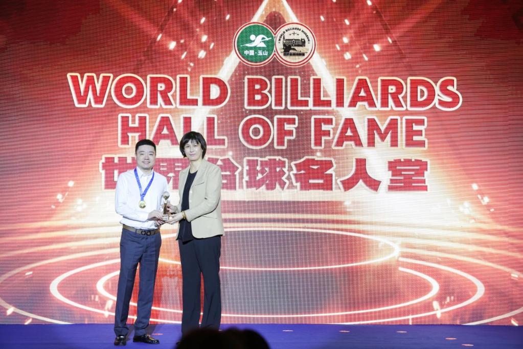 中国台球协会主席王涛为丁俊晖颁发入堂奖杯。