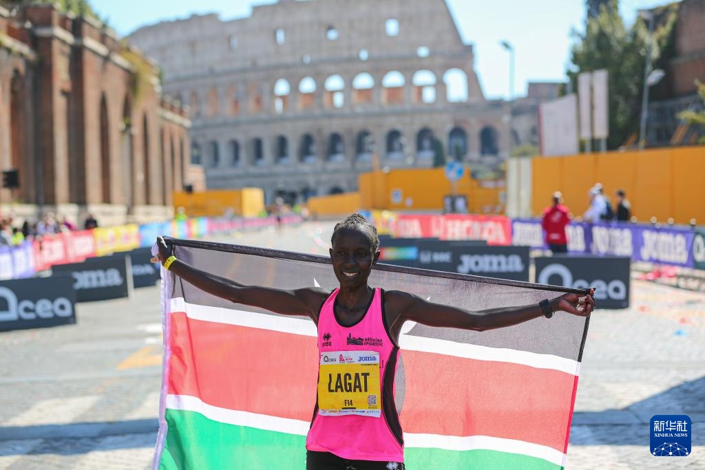 3月17日,肯尼亚选手拉加特在夺冠后庆祝。她以2小时24分36秒的成绩获得女子组冠军。新华社记者 李京 摄