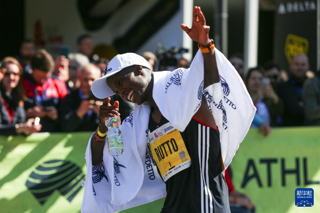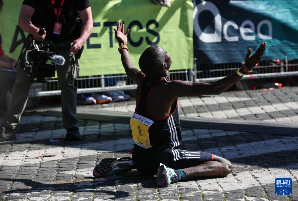 3月17日,肯尼亚选手阿斯贝尔在夺冠后庆祝。他以2小时6分24秒的成绩获得男子组冠军。新华社记者 李京 摄