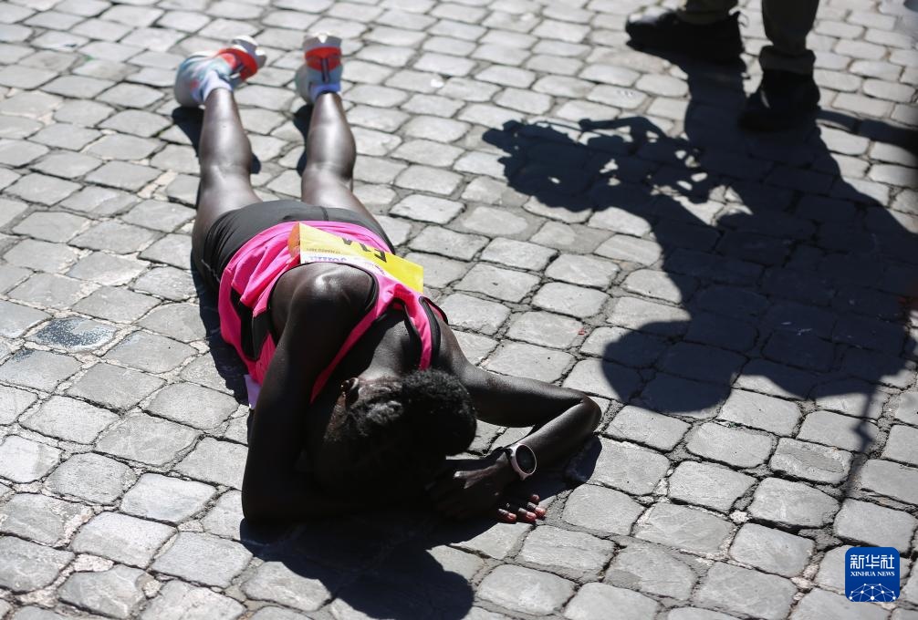 3月17日,肯尼亚选手拉加特在冲线后倒地。她以2小时24分36秒的成绩获得女子组冠军。新华社记者 李京 摄