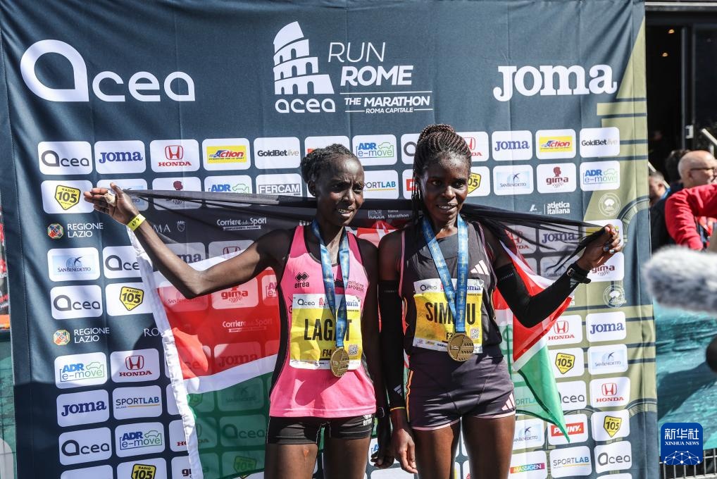 3月17日,肯尼亚选手拉加特(左)和队友西米尤在赛后庆祝。拉加特以2小时24分36秒的成绩获得女子组冠军,西米尤以2小时25分10秒的成绩获得女子组亚军。新华社记者 李京 摄