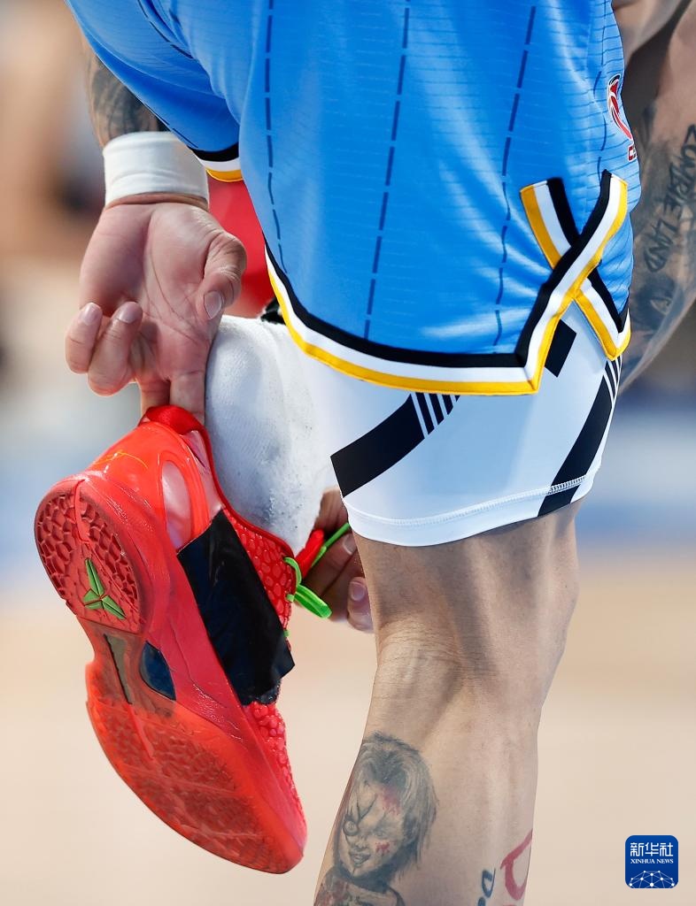 3月17日,北京北汽队球员阿斯起亚·布克在比赛中穿上被踩掉的球鞋。新华社记者 王丽莉 摄