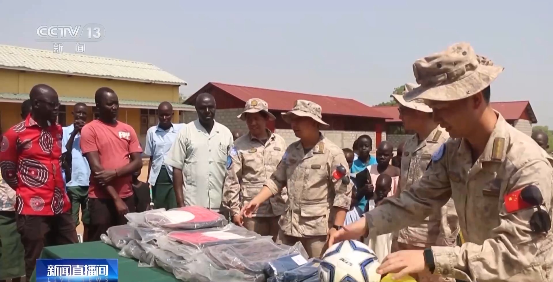 任务返回途中,巡逻分队带领部分官兵来到蒙加拉当地学校走访慰问,为学生们送去书包、文具、足球等文体用品。