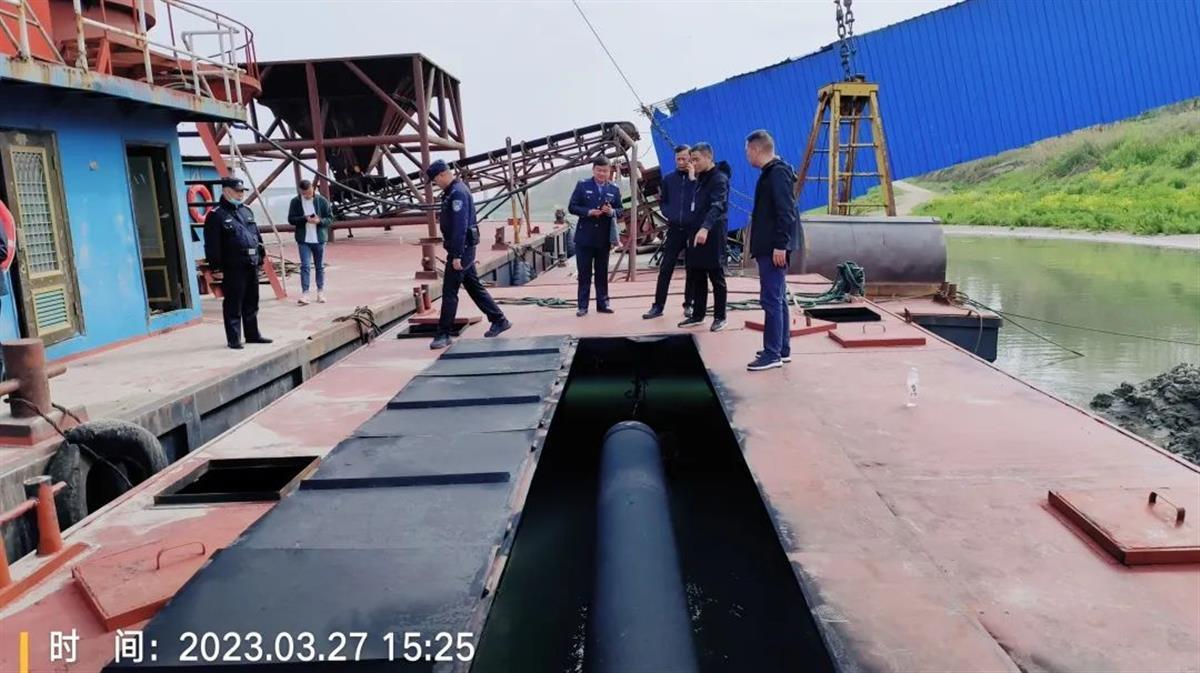 2023年3月27日,省水利厅指挥调度仙桃、汉川两地水利执法人员,在汉江汉川和仙桃交界水域查获涉嫌非法采砂的隐形采砂船1艘、载有江砂的运输船3艘、空载运输船1艘,查缴江砂2441.72吨(均含有天然石英砂成分,属于矿产资源),价值10.98万元。经省厅指定管辖,该案交由汉川市公安局主办,4月4日,汉川市局联合相关职能部门将涉案船只扣押,并对涉案江砂开展卸货、称重、取样送检等工作。