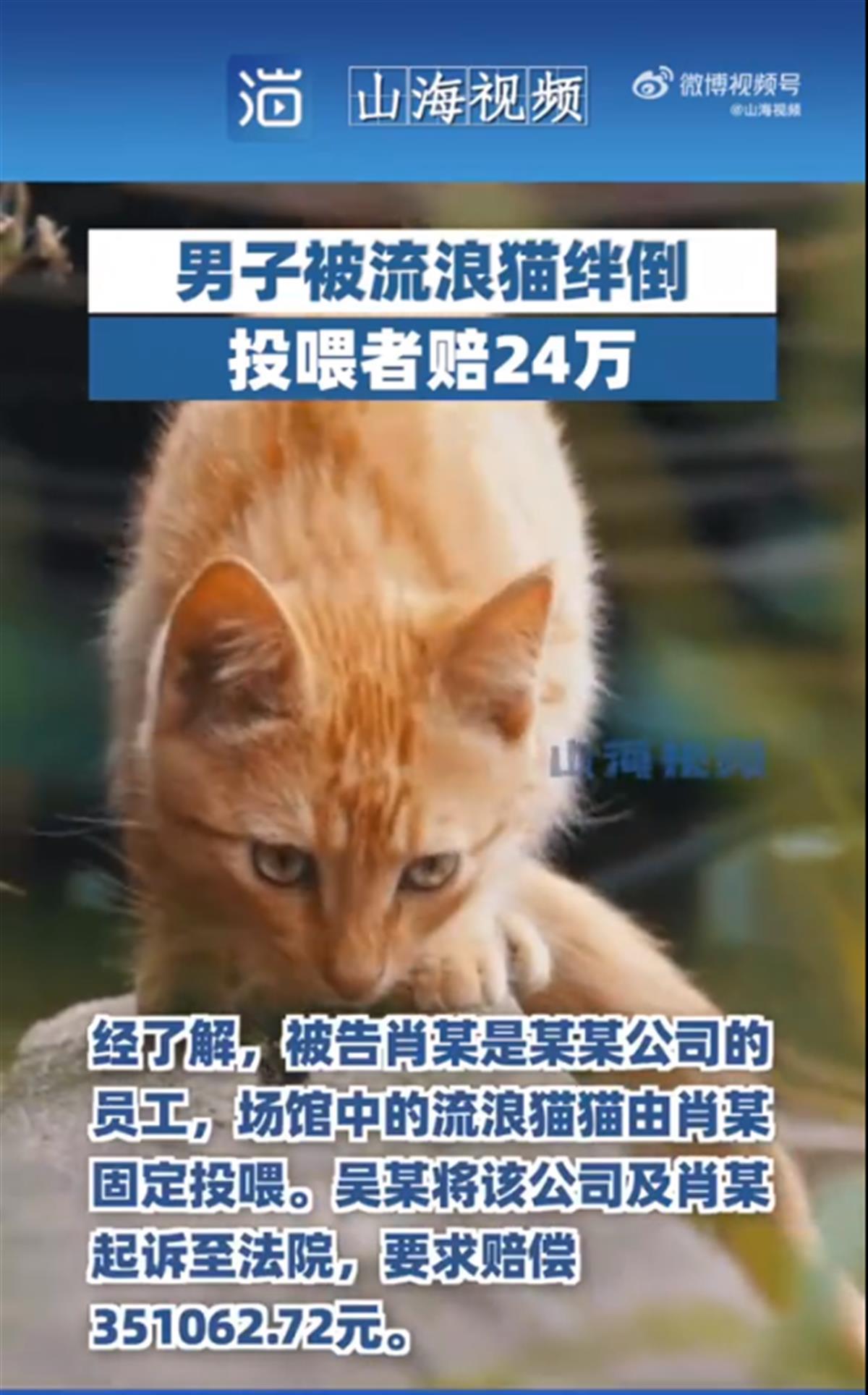 2023年4月20日,男子吴某与同事在羽毛球馆打球时,踩到流浪猫肚子上致摔倒,构成十级伤残。吴某遂将羽毛球馆所属公司和流浪猫投喂者肖某诉至法院。3月19日,澎湃新闻记者从中国裁判文书网获悉,这起生命权、身体权、健康权纠纷案件,上海市闵行区人民法院经审理,一审判决被告肖某于赔偿原告240198.20元;被告羽毛球馆所在公司对被告肖某不能赔偿的相应部分,承担补充赔偿责任。被告羽毛球馆所在公司承担补充责任后,可以向被告肖某追偿。(据3月19日澎湃新闻)