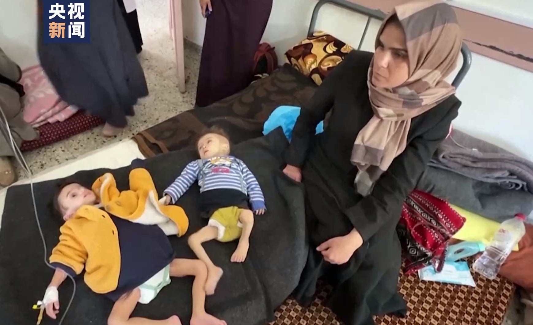 △拉法一家医疗中心内,两名幼童躺在床上,他们面容瘦削、眼睛凹陷。