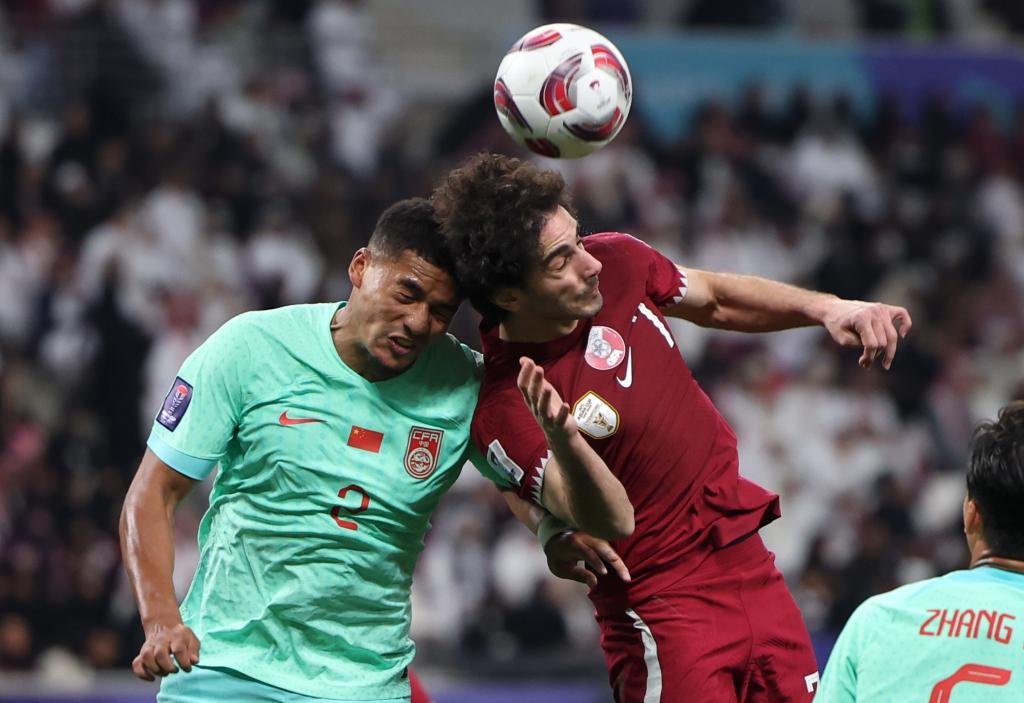 1月22日的亚洲杯小组赛中,中国队球员蒋光太(左)与卡塔尔队球员艾哈迈德·阿拉丁争顶。新华社记者 曹灿 摄