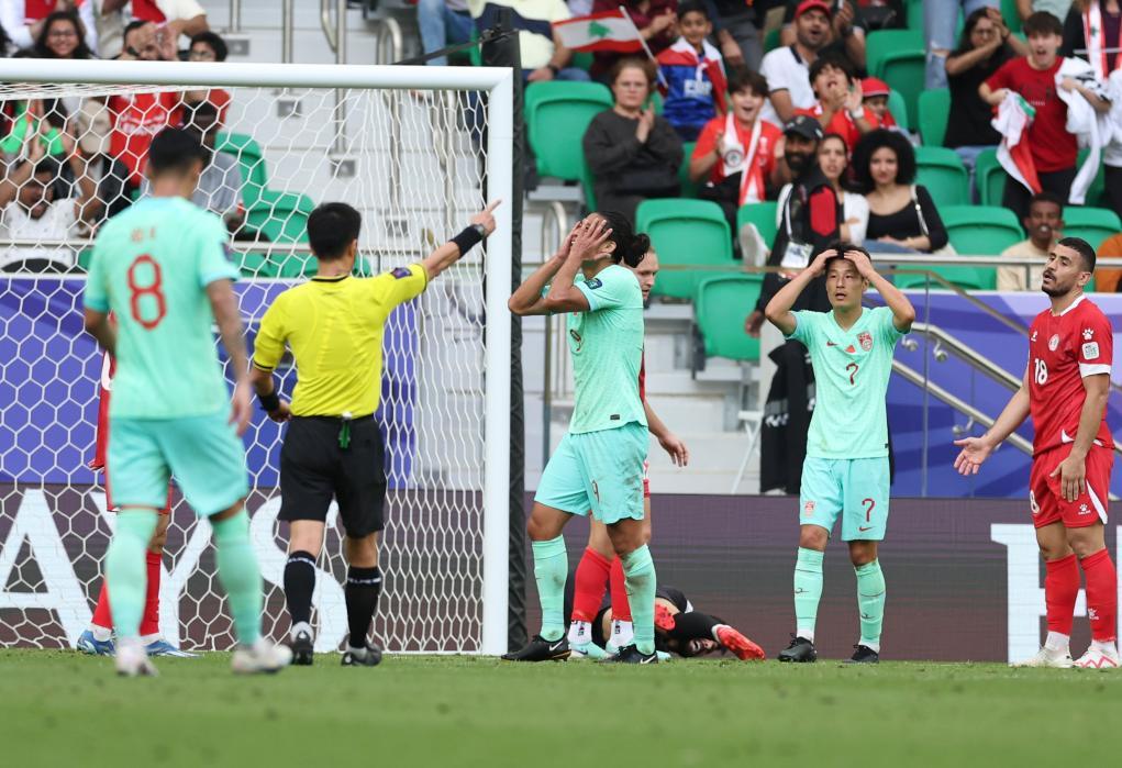 1月17日战平黎巴嫩队的亚洲杯小组赛中,中国队球员张玉宁(中)、武磊(右二)先后错失进球机会。新华社记者 贾浩成 摄