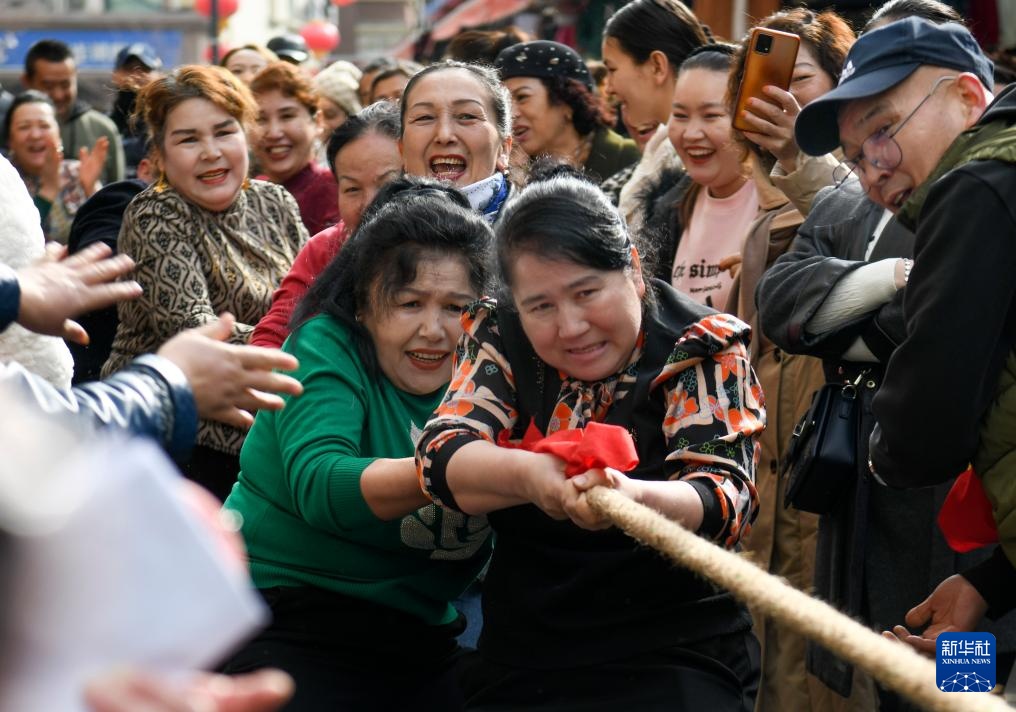 3月20日,居民和商户参加拔河比赛。新华社记者 王菲 摄