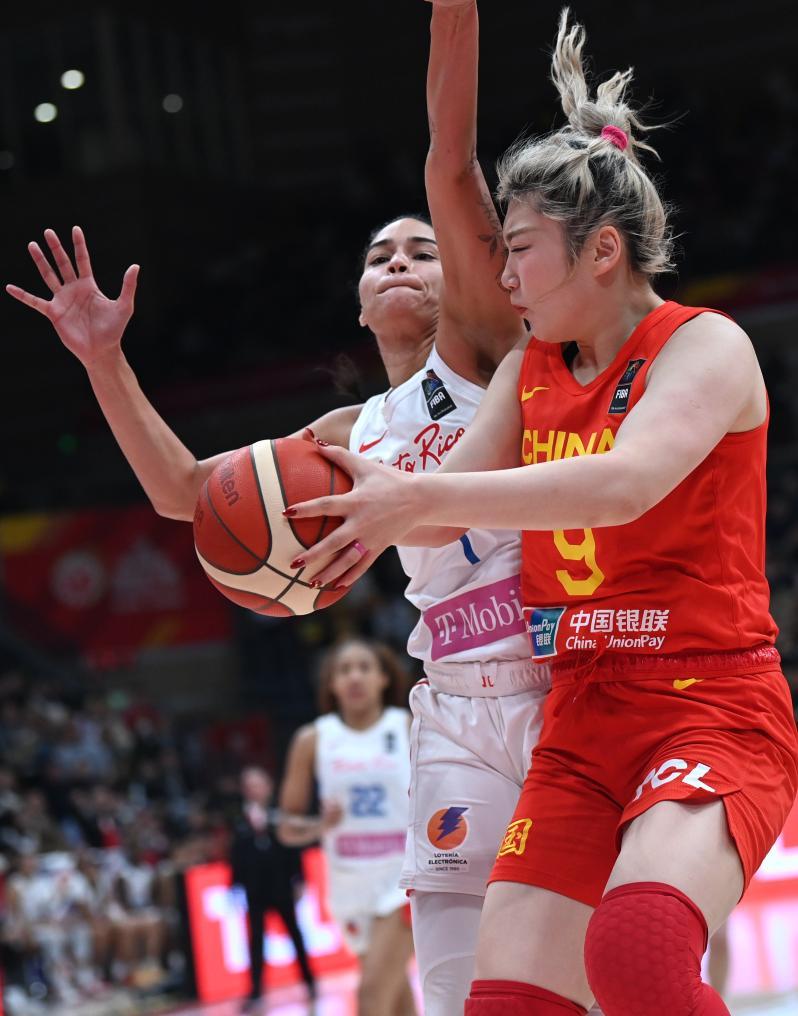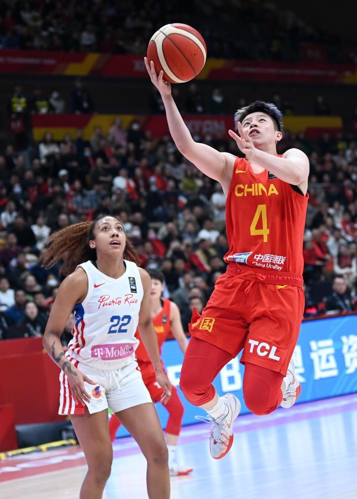2月11日,中国队球员李缘(右)在2024国际篮联奥运女篮资格赛中上篮。新华社记者 李一博 摄
