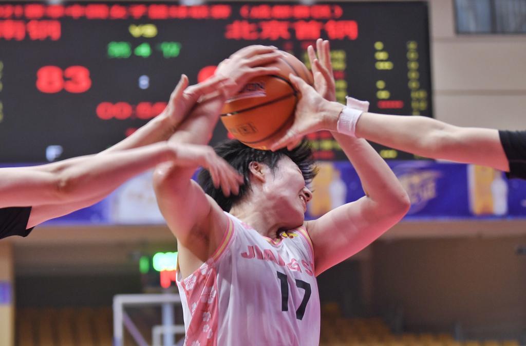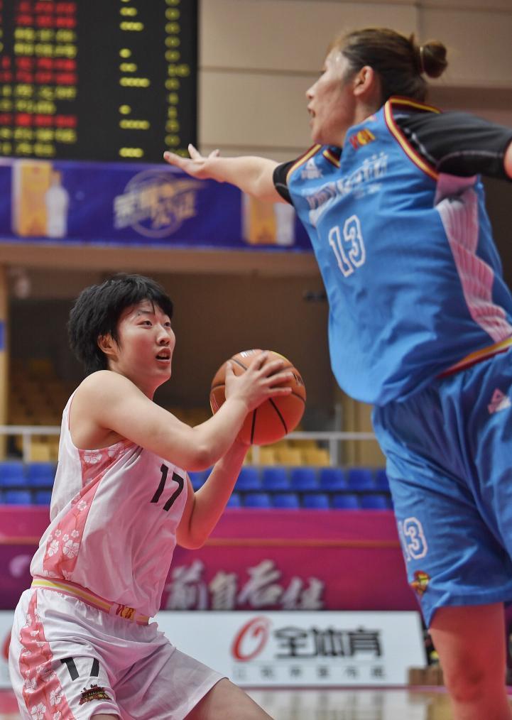2020年10月1日,2020-2021赛季中国女子篮球联赛(成都赛区)常规赛第一轮,江苏南钢队球员罗欣棫在比赛中拼抢。新华社记者刘坤摄