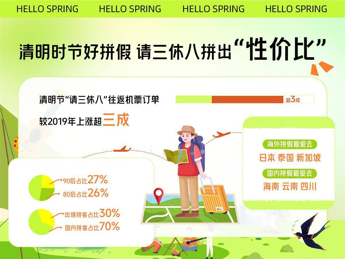 尽管清明节只放3天假,但不少年轻人或上班族选择前后拼假拉长假期。4月1日至3日请3天假期,即可拼出8天的长假。为此众多“请三休八”的拼假游客清明期间选择长线游、出境游。数据显示,“请三休八”的国内往返机票订单比2019年同期增长超三成;其中七成人选择拼假境内游,三成选择出境游;拼假旅游的用户年龄集中在90、80后,分别占比27%和26%。拼假出境游的用户清明节最爱去日本、泰国和新加坡,在国内人们拼假更爱去海南、云南和四川旅游。数据显示,湖北人清明假期热门出境目的地为日本、泰国、新加坡、韩国和澳大利亚。