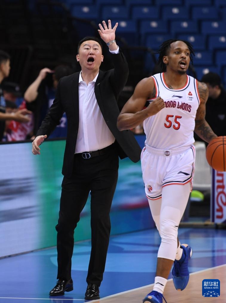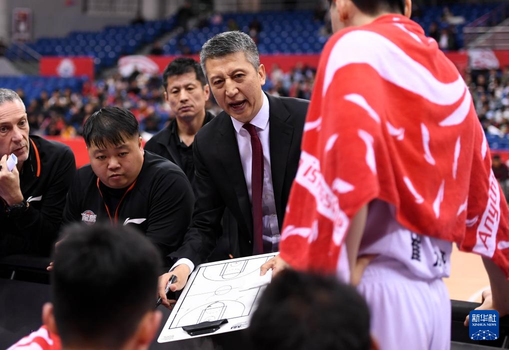 3月21日,青岛国信水产队主教练刘维伟(左)在比赛中指挥球员。新华社记者 李紫恒 摄