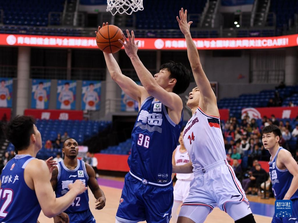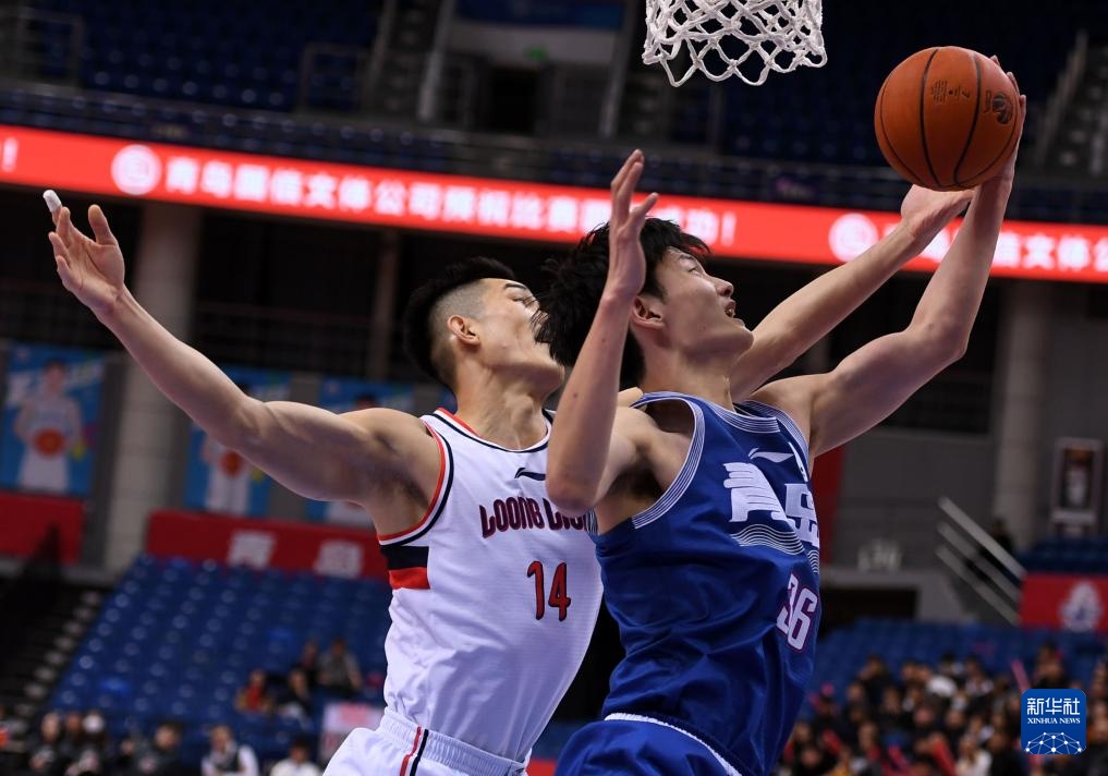 3月21日,广州龙狮队球员崔永熙(左)在青岛国信水产队球员纪卓的防守下上篮。新华社记者 李紫恒 摄